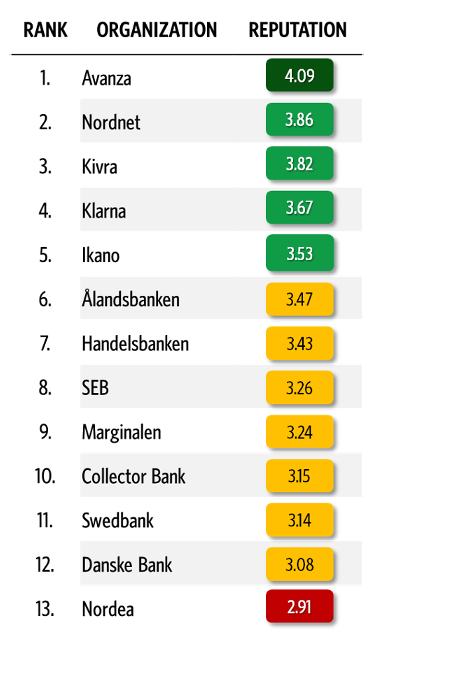 Avanza hamnar högst upp på listan med snittbetyget 4,09 av fem möjliga, följda av Nordnet och Kivra som också får höga betyg. Även Klarna och Ikano hamnar på rätt sida om strecket som ger dem ett bra anseende i svenska folkets ögon. Längst ner hamnar flera av de traditionella bankerna.